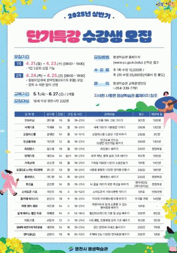 [»çȸ] ¿µÃµ½Ã Æò»ýÇнÀ°ü, »ó¹Ý±â ´Ü±âƯ°­ ¼ö°­»ý ¸ðÁý |2025. 04.07