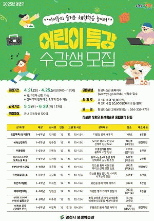 [NWS¹æ¼Û=Çѽ¸ñ ±âÀÚ]¿µÃµ½Ã Æò»ýÇнÀ°üÀº ¿À´Â 21ÀϺÎÅÍ 25ÀϱîÁö °ü³» ÃʵîÇлýµéÀ» ´ë»óÀ¸·Î ¡®2025³â »ó¹Ý±â ¾î¸°ÀÌÆ¯°­¡¯ ¼ö°­»ýÀ» ¸ðÁýÇÑ´Ù. À̹ø ¾î¸°ÀÌ Æ¯°­Àº ¡â¿À°¨ÅåÅå âÀǰø¿¹ ¡â¾¦¾¦ ¼ºÀå¿ä°¡ ¡â¿ìÄð·¼·¹ ¡âµ¿È­³í¼ú¹Ì¼ú¡¦