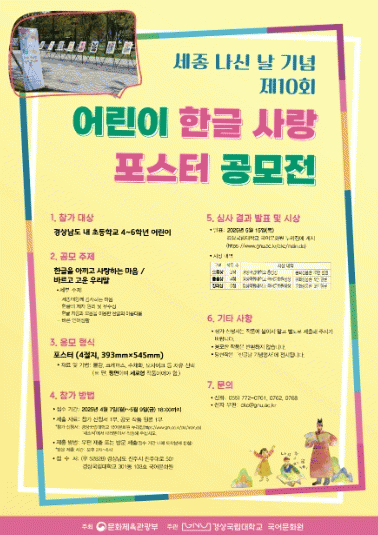 [NWS¹æ¼Û=Çѽ¸ñ ±âÀÚ]°æ»ó±¹¸³´ëÇб³(GNU) ±¹¾î¹®È­¿øÀº Á¦628µ¹ ¼¼Á¾ ³ª½Å ³¯(5¿ù 15ÀÏ)À» ¸ÂÀÌÇØ ¡®Á¦10ȸ ¾î¸°ÀÌ ÇÑ±Û »ç¶û Æ÷½ºÅÍ °ø¸ðÀü¡¯À» °³ÃÖÇÑ´Ù. ¿ÃÇØ·Î ¿­ ¹øÂ°¸¦ ¸ÂÀÌÇÏ´Â À̹ø °ø¸ðÀüÀº °æ»ó³²µµ ³» ÃʵîÇб³ 4~6Çг⠾