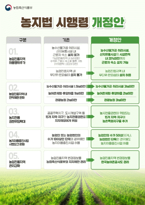 [NWS¹æ¼Û=Çѽ¸ñ ±âÀÚ]³ó¸²Ãà»ê½ÄǰºÎ´Â ³ó¾÷ÁøÈïÁö¿ª ³» Çã¿ë ½Ã¼³°ú ¸éÀûÀ» È®´ëÇÏ´Â µî ³óÁö±ÔÁ¦¸¦ ¿ÏÈ­ÇÏ´Â '³óÁö¹ý ½ÃÇà·É'°³Á¤¾ÈÀ» ÀÔ¹ý¿¹°íÇÑ´Ù. ±×µ¿¾È ³ó¾÷ÁøÈïÁö¿ª¿¡ ¼³Ä¡ÇÒ ¼ö ¾ø¾ú´ø ±Ù·ÎÀÚ ¼÷¼Ò¿Í ¹«´õÀ§¡¤ÇÑÆÄ ½°ÅÍÀÇ ¼³¡¦