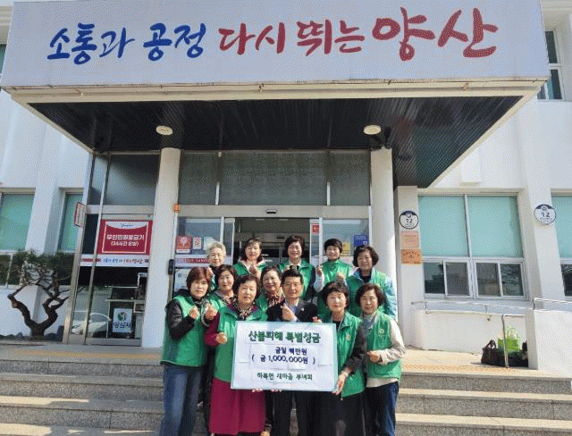 [NWS¹æ¼Û=Çѽ¸ñ ±âÀÚ]¾ç»ê½Ã ÇÏºÏ¸é »õ¸¶À»ºÎ³àȸ´Â Áö³­ 4ÀÏ ÇϺϸéÇàÁ¤º¹Áö¼¾Å͸¦ ¹æ¹®ÇÏ¿© ¿µ³² »êºÒÇÇÇØ º¹±¸¸¦ À§ÇØ »ç¿ëÇØ´Þ¶ó¸ç 100¸¸¿øÀ» ±âŹÇß´Ù. À̹ø ¼º±Ý Àü´ÞÀº ÃÖ±Ù ¹ß»ýÇÑ »êºÒ·Î ÀÎÇØ ¾î·Á¿òÀ» °Þ°í ÀÖ´Â ÇÇÇØ Áֹε顦