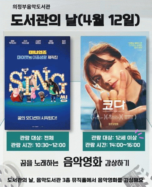 [NWS¹æ¼Û=Çѽ¸ñ ±âÀÚ]ÀÇÁ¤ºÎÀ½¾Çµµ¼­°üÀº 4¿ù 12ÀÏ µµ¼­°üÀÇ ³¯À» ±â³äÇØ ¡®²ÞÀ» Ű¿ì´Â À½¾Ç¿µÈ­¡¯ ¹«·á »ó¿µÈ¸¸¦ ¿¬´Ù. À̹ø Çà»ç´Â µµ¼­°üÀÇ ¼ÒÁßÇÑ °¡Ä¡¿Í ¹®È­Àû ±â´ÉÀ» ¾Ë¸®°í, ½Ã¹Îµé¿¡°Ô À½¾Ç°ú ¿µÈ­°¡ ¾î¿ì·¯Áø º¹ÇÕ¹®È­ üÇ衦
