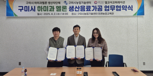 [NWS¹æ¼Û=ÇãÀº¼­ ±âÀÚ]±¸¹Ì½Ã´Â Áö³­ 2ÀÏ ³ó¾÷±â¼ú¼¾ÅÍ ¹Ì·¡³ó¾÷±³À°°ü¿¡¼­ ÇϹ̰ú¸á·Ð»ý»êÀÚ´Üü, ¢ß¿¤ÄÚ¾îÄÚÆÛ·¹À̼ǰú ÇϹ̰ú ¸á·ÐÀÇ »ý»ê ¹× À½·á °¡°øÀ» À§ÇÑ ¾÷¹«Çù¾àÀ» ü°áÇß´Ù. Çù¾à½Ä¿¡´Â °­Ã¢¼® ÇϹ̰ú¸á·Ð»ý»êÀÚ´Üü ´ëÇ¥, ¡¦