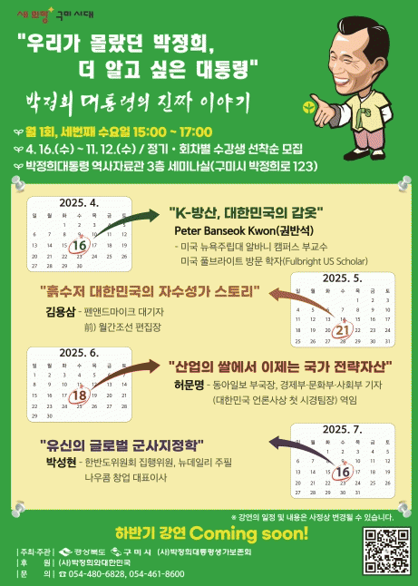 [NWS¹æ¼Û=Çѽ¸ñ ±âÀÚ]±¸¹Ì½Ã´Â ¹ÚÁ¤Èñ ´ëÅë·ÉÀÇ ¸®´õ½ÊÀ» ÀçÁ¶¸íÇÏ´Â °­¿¬¡°¿ì¸®°¡ ¸ô¶ú´ø ¹ÚÁ¤Èñ, ´õ ¾Ë°í ½ÍÀº ´ëÅë·É - ¹ÚÁ¤Èñ ´ëÅë·ÉÀÇ ÁøÂ¥ À̾߱⡱¸¦ 4¿ù 16ÀϺÎÅÍ 11¿ù 12ÀϱîÁö ¹ÚÁ¤Èñ´ëÅë·É¿ª»çÀÚ·á°ü 3Ãþ ¼¼¹Ì³ª½Ç¿¡¼­ ÃÑ 7ȸ¡¦
