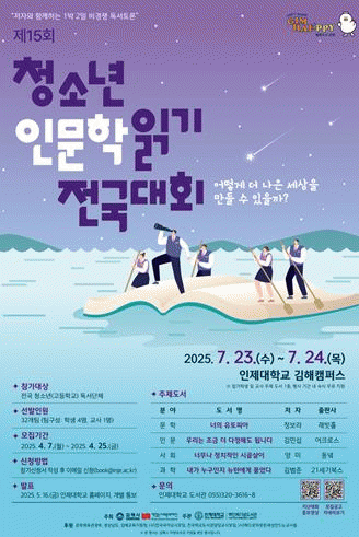 [NWS¹æ¼Û=Çѽ¸ñ ±âÀÚ]±èÇØ½Ã´Â 7ÀϺÎÅÍ 25ÀϱîÁö Á¦15ȸ û¼Ò³â Àι®ÇÐÀбâ Àü±¹´ëȸ Âü°¡ÆÀÀ» ¸ðÁýÇÑ´Ù°í ¹àÇû´Ù. ±èÇØ½Ã¿Í Ã¥Àд»çȸ¹®È­Àç´ÜÀÌ ÁÖÃÖÇϰí ÀÎÁ¦´ëÇб³°¡ ÁÖ°üÇϴ û¼Ò³â Àι®ÇÐÀбâ Àü±¹´ëȸ´Â 7¿ù 23ÀϺÎÅÍ 24ÀÏ¡¦