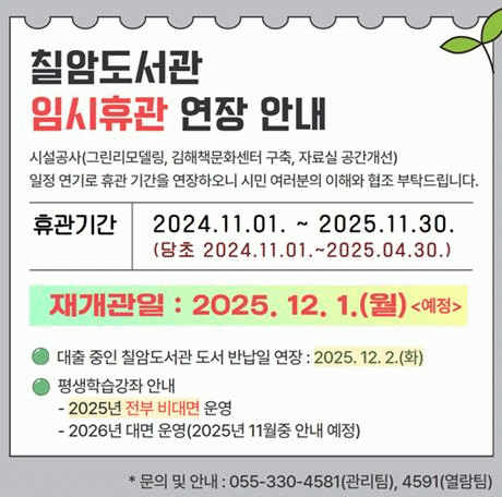 [NWS¹æ¼Û=Çѽ¸ñ ±âÀÚ]±èÇØ½Ã Ä¥¾Ïµµ¼­°üÀº ½Ã¼³ °ø»ç·Î ÀÎÇÑ ÀÓ½ÃÈÞ°üÀ» ¿À´Â 11¿ù±îÁö ¿¬ÀåÇÑ´Ù°í 7ÀÏ ¹àÇû´Ù. Ä¥¾Ïµµ¼­°üÀº ±¹Åä±³ÅëºÎ °ø¸ð ±×¸°¸®¸ðµ¨¸µ »ç¾÷°ú ¹®È­Ã¼À°°ü±¤ºÎÀÇ Ã¥¹®È­¼¾ÅÍ Á¶¼º»ç¾÷¿¡ °¢°¢ ¼±Á¤µÅ ÀÛ³â 11¿ù Âø°ø¡¦