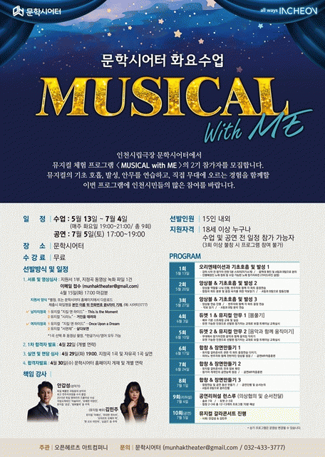 [NWS¹æ¼Û=Çѽ¸ñ ±âÀÚ]ÀÎõ±¤¿ª½Ã´Â (»ç)ÀÎõ¿¹ÃÑÀÌ ¿î¿µÇÏ´Â ¹®ÇнþîÅÍ¿¡¼­ ¹ÂÁöÄà üÇè ÇÁ·Î±×·¥ ¡®MUSICAL with ME¡¯ 2±â Âü°¡ÀÚ¸¦ ¸ðÁýÇÑ´Ù°í ¹àÇû´Ù. ÀÌ ÇÁ·Î±×·¥Àº ¹ÂÁöÄÃÀ» ²Þ²Ù´Â ½Ã¹Îµé¿¡°Ô Á÷Á¢ ¹«´ë¿¡ ¿À¸£´Â °æÇèÀ» Á¦°øÇÏ¡¦