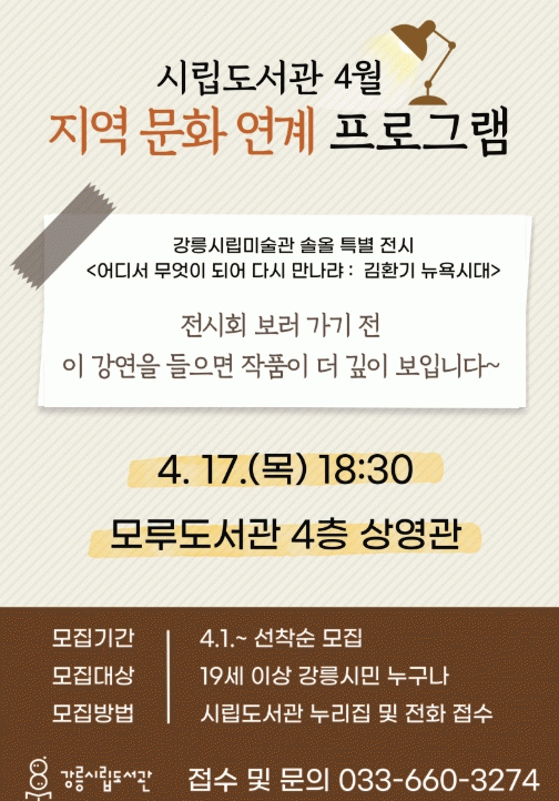 [NWS¹æ¼Û=Çѽ¸ñ ±âÀÚ]°­¸ª½Ã¸³µµ¼­°üÀº Àü½Ã¿Í °ø¿¬ µî ´Ù¾çÇÑ Áö¿ª ¹®È­¸¦ ½Ã¹ÎµéÀÌ ´õ ½±°Ô ÀÌÇØÇϰí Á¢±ÙÇÒ ¼ö ÀÖ´Â ±âȸ¸¦ Á¦°øÇϱâ À§ÇØ ¿À´Â 17ÀϺÎÅÍ Áö¿ª ¹®È­ ¿¬°è ÇÁ·Î±×·¥À» ½ÃÀÛÇÑ´Ù. 4¿ù ù °­¿¬ ÁÖÁ¦´Â °­¸ª½Ã¸³¹Ì¼ú°ü¡¦