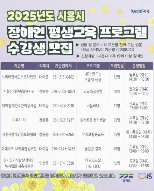 [NWS¹æ¼Û=Çѽ¸ñ ±âÀÚ]½ÃÈï½Ã´Â °ü³» ¼ºÀÎ Àå¾ÖÀÎÀ» ´ë»óÀ¸·Î Æò»ý±³À° ÇÁ·Î±×·¥ Á¦°øÀ» À§ÇÑ ¡®2025³â ½ÃÈï½Ã Àå¾ÖÀÎ Æò»ý±³À° ÇÁ·Î±×·¥ Áö¿ø»ç¾÷¡¯ ÇнÀÀÚ¸¦ ¸ðÁýÇÑ´Ù. À̹ø ÇÁ·Î±×·¥Àº Àå¾ÖÀÎÀÇ ÀÚ¸³°ú »çȸÂü¿©¸¦ ÃËÁøÇϱâ À§ÇØ ¸¶·Ã¡¦