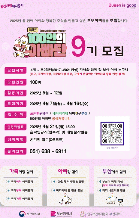[NWS¹æ¼Û=Çѽ¸ñ ±âÀÚ] ºÎ»ê½Ã´Â ¾ÆºüµéÀÇ Àû±ØÀûÀÎ À°¾Æ Âü¿©¿Í ÇÔ²² À°¾ÆÇÏ´Â »çȸ ºÐÀ§±â Á¶¼ºÀ» À§ÇØ ¿À´Ã(7ÀÏ)ºÎÅÍ 4¿ù 16ÀϱîÁö 'ºÎ»ê 100ÀÎÀÇ ¾Æºü´Ü(9±â)'À» ¸ðÁýÇÑ´Ù°í ¹àÇû´Ù. ½Ã´Â ¿ÃÇØ ¾Æºü´Ü Âü¿© ´ë»óÀ» ±âÁ¸ 4~7¼¼¿¡¼­,¡¦