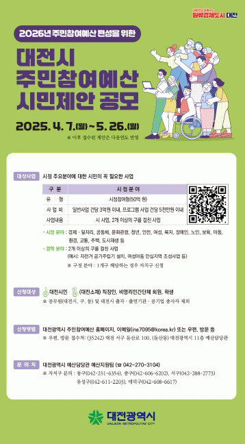 [NWS¹æ¼Û=Çѽ¸ñ ±âÀÚ]´ëÀü½Ã´Â 2025³â 4¿ù 7ÀϺÎÅÍ 5¿ù 26ÀϱîÁö 2026³âµµ ÁÖ¹ÎÂü¿©¿¹»ê Æí¼ºÀ» À§ÇÑ ½Ã¹Î Á¦¾È °ø¸ð¸¦ ½Ç½ÃÇÑ´Ù. °ø¸ð¿¡´Â ´ëÀü ½Ã¹ÎÀº ¹°·Ð, ´ëÀü ¼ÒÀç »ç¾÷üÀÇ Á÷ÀåÀÎ, ºñ¿µ¸®¹Î°£´Üü ȸ¿ø, Çб³ Çлý µîµµ Âü¿©ÇÒ¡¦