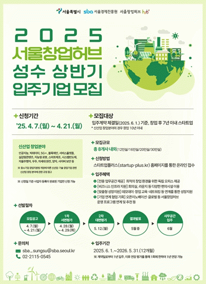 [»çȸ] ESG â¾÷°ÅÁ¡ '¼­¿ïâ¾÷Çãºê ¼º¼ö', »ó¹Ý±â ÀÔÁÖ±â¾÷ 8°³»ç ¸ðÁý |2025. 04.06