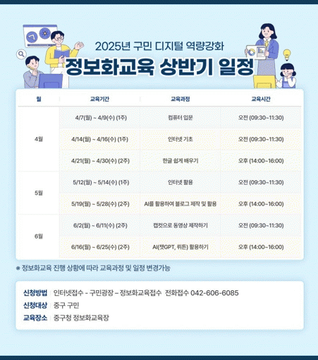 [NWS¹æ¼Û=Çѽ¸ñ ±âÀÚ]´ëÀü Áß±¸´Â û³» Á¤º¸È­±³À°Àå¿¡¼­ 4¿ù 7ÀϺÎÅÍ 6¿ù±îÁö ±¸¹Î µðÁöÅÐ ¿ª·®°­È­¸¦ À§ÇÑ 2025³â »ó¹Ý±â Á¤º¸È­±³À°À» ¿î¿µÇÑ´Ù°í ¹àÇû´Ù. À̹ø ±³À°Àº ½Ç»ýȰ Áß½ÉÀÇ ¼öÁغ° ¸ÂÃãÇü °­ÀǸ¦ ÅëÇØ Áö¿ª ÁֹΠ°£ Á¤º¸¡¦