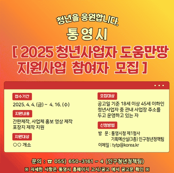 [NWS¹æ¼Û=Çѽ¸ñ ±âÀÚ]Å뿵½Ã¿¡¼­´Â 4¿ù 4ÀϺÎÅÍ 16ÀϱîÁö 'Å뿵½Ã û³â»ç¾÷ÀÚ µµ¿ò¸¸¶¥ Áö¿ø»ç¾÷' Âü¿©ÀÚ¸¦ ¸ðÁýÇÑ´Ù°í ¹àÇû´Ù. Áö¿ø´ë»óÀº °ø°íÀÏ ±âÁØ 18¼¼ ÀÌ»ó 45¼¼ ÀÌÇÏÀΠû³â»ç¾÷ÀÚ Áß Å뿵½Ã °ü³» »ç¾÷Àå ÁÖ¼Ò¸¦ µÎ°í ¿î¿µÇÏ°í¡¦