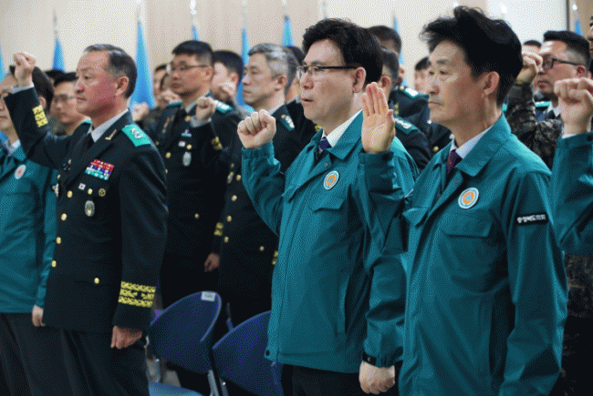 [NWS¹æ¼Û=Çѽ¸ñ ±âÀÚ] ÃæºÏµµ´Â 4¿ù 4ÀÏ µµÃ» ´ëȸÀǽǿ¡¼­ â¼³ Á¦57Áֳ⠿¹ºñ±ºÀÇ ³¯À» ±â³äÇÏ¿© À̵¿¿Á ÇàÁ¤ºÎÁö»ç, 37»ç´ÜÀå, µµ³» ¿¹ºñ±º ÁöÈÖ°ü µî 180¿© ¸íÀÌ Âü¼®ÇÑ °¡¿îµ¥ ¿¹ºñ±º â¼³ÀÇ ÀÇÀǸ¦ ¼±¾çÇÏ°í ¿¹ºñ±ºÀÇ »ç¸í°¨°ú ÀÚ¡¦