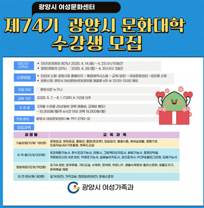 [»çȸ] ±¤¾ç½Ã ¿©¼º¹®È­¼¾ÅÍ, Á¦74±â ±¤¾ç½Ã ¹®È­´ëÇÐ ¼ö°­»ý¸ðÁý |2025. 04.04