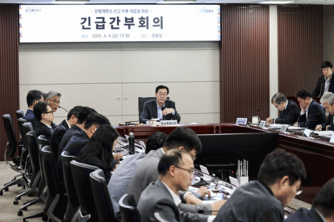 [NWS¹æ¼Û=Çѽ¸ñ ±âÀÚ]Á¤¸í±Ù È­¼ºÆ¯·Ê½ÃÀåÀÌ 4ÀÏ º»Ã» 2Ãþ »óȲ½Ç¿¡¼­ Çå¹ýÀçÆÇ¼ÒÀÇ À±¼®¿­ ´ëÅë·É źÇÙ ÀÎ¿ë ¼±°í¿¡ µû¸¥ ÈÄ¼Ó ´ëÀÀÀ» ³íÀÇÇϱâ À§ÇØ ±ä±Þ°£ºÎȸÀǸ¦ °³ÃÖÇß´Ù. À̳¯ ȸÀÇ´Â ´ëÅë·É źÇÙ¿¡ µû¶ó Á¦ 21´ë ´ë¼± ´ç¼±ÀÎ Ã롦