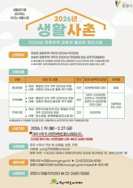 [»çȸ] ±¤¸í½Ã, ÀÌ¿ô°ú ÇÔ²² º¯È­ ¸¸µå´Â '»ýȰ»çÃÌ' °øµ¿Ã¼ Ȱµ¿¿¡ ÃÖ´ë 1õ¸¸ ¿ø Áö¿ø |2026. 01.19
