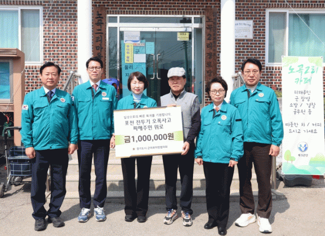 [NWS¹æ¼Û=Çѽ¸ñ ±âÀÚ]°æ±âµµ½Ã¡¤±ºÀÇȸÀÇÀåÇùÀÇȸ(Á÷¹«´ëÇà ¼ö¼®ºÎȸÀå À¯Áø¼± ¿ëÀÎÆ¯·Ê½ÃÀÇȸ ÀÇÀå)°¡ 4ÀÏ Æ÷õ½ÃÀÇȸ¸¦ ¹æ¹®ÇÏ¿© °ø±ºÀüÅõ±â ¿ÀÆø »ç°í ÇÇÇØ Áö¿øÀ» À§ÇÑ À§·Î±Ý 100¸¸ ¿øÀ» Àü´ÞÇß´Ù°í ¹àÇû´Ù. ƯÈ÷, ÇùÀÇȸ´Â Áö³­´Þ¡¦
