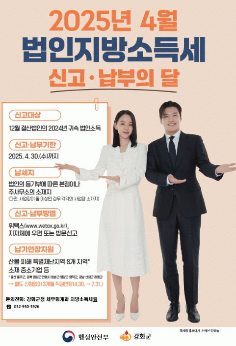 [NWS¹æ¼Û=Çѽ¸ñ ±âÀÚ]°­È­±ºÀÌ 4¿ù ¹ýÀÎ Áö¹æ¼Òµæ¼¼ ÁýÁß ½Å°í¡¤³³ºÎ ±â°£À» ¿î¿µÇÑ´Ù. ½Å°í ´ë»óÀº °ü³» ¹ýÀÎ »ç¾÷ÀåÀ¸·Î, 12¿ù¸» °á»ê¹ýÀÎÀÇ 2024³â ±Í¼Ó ¹ýÀμҵæÀÌ´Ù. ½Å°í±âÇÑÀº ¿À´Â 4¿ù 30ÀϱîÁöÀÌ´Ù. ½Å°í ¹æ¹ýÀº ¿Â¶óÀÎ ½Å¡¦