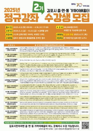 [NWS¹æ¼Û=Çѽ¸ñ ±âÀÚ]±èÆ÷½Ã´Â ½Ã¹Îµé¿¡°Ô ´Ù¾çÇÑ Æò»ýÇнÀ ±âȸ¸¦ Á¦°øÇϰí, ÇнÀ ¼öÁØ ¹× »îÀÇ Áú Çâ»óÀ» À§ÇØ À¾¸éµ¿ °¡±îÀ̹è¿òÅÍ¿¡¼­ 2025³â Á¦2±â Á¤±Ô°­Á ¼ö°­»ýÀ» ¸ðÁýÇÑ´Ù. ¸ðÁý ±â°£Àº 4¿ù 8ÀϺÎÅÍ 16ÀϱîÁöÀ̸ç, ±èÆ÷½Ã¿¡ ÁÖ¡¦