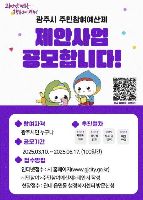 [NWS¹æ¼Û=Çѽ¸ñ ±âÀÚ]±¤Áֽô ¿À´Â 6¿ù 17ÀϱîÁö ÁֹεéÀÌ Á÷Á¢ »ç¾÷À» Á¦¾È¡¤½ÉÀÇÇÒ ¼ö ÀÖ´Â ÁֹΠÂü¿©¿¹»ê Á¦¾È »ç¾÷À» ½Åû¹Þ´Â´Ù°í 4ÀÏ ¹àÇû´Ù. ±¤ÁֽùÎÀÌ¸é ´©±¸³ª Á¦¾ÈÇÒ ¼ö ÀÖÀ¸¸ç °ø¸ð ±â°£(2025. 3.10 ~ 6.17) µ¿¾È ȨÆäÀÌÁö¡¦