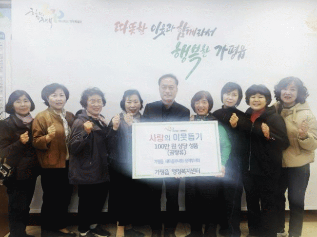 [NWS¹æ¼Û=Çѽ¸ñ ±âÀÚ]°¡ÆòÀ¾Àº ÃÖ±Ù °¡ÆòÀ¾ »õ¸¶À»ºÎ³àȸ¿Í ±¤¿ªºÎ³àȸ°¡ °ü³» Àú¼ÒµæÃþÀ» À§ÇØ 100¸¸ ¿ø »ó´çÀÇ °õÅÁÀ» ±âŹÇß´Ù°í ¹àÇû´Ù. ±âºÎ Çà»ç´Â °¡ÆòÀ¾ÇàÁ¤º¹Áö¼¾ÅÍ¿¡¼­ ÁøÇàµÆ´Ù. Àü´ÞµÈ °õÅÁÀº Áö³­ 3¿ù 8ÀÏ ¿­¸° °¡ÆòÀ¾ À·¡¦