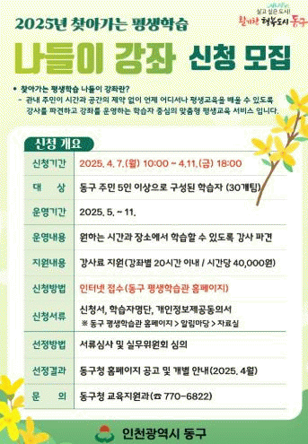 [NWS¹æ¼Û=Çѽ¸ñ ±âÀÚ]ÀÎõ µ¿±¸´Â 2025³â ã¾Æ°¡´Â Æò»ýÇнÀ ¡®³ªµéÀÌ °­Á¡¯ ½ÅûÀ» ¿À´Â 7ÀÏ~11ÀϱîÁö Á¢¼öÇÑ´Ù°í ¹àÇû´Ù. ³ªµéÀÌ °­Á´ ÇнÀÀÚ°¡ ¿øÇÏ´Â ½Ã°£°ú Àå¼Ò¿¡¼­ Æò»ý±³À°À» ¹è¿ï ¼ö ÀÖµµ·Ï °­»ç¸¦ ÆÄ°ßÇÏ°í °­Á¸¦ ¿î¿µÇÏ¡¦