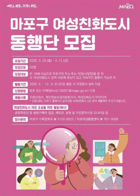 [NWS¹æ¼Û=Çѽ¸ñ ±âÀÚ]¸¶Æ÷±¸´Â 4¿ù 11ÀϱîÁö ¡®¸¶Æ÷±¸ ¿©¼ºÄ£È­µµ½Ã µ¿Çà´Ü¡¯À¸·Î Ȱµ¿ÇÒ ´Ü¿øÀ» ¸ðÁýÇÑ´Ù. ¿©¼ºÄ£È­µµ½Ã µ¿Çà´ÜÀº ÀÏ»ó»ýȰ¿¡¼­ ¹ß»ýÇÏ´Â ¼ºº° ºÒ±ÕÇü ¹®Á¦¸¦ °üÂûÇÏ¿© °³¼± ¹æ¾ÈÀ» Á¦¾ÈÇÏ°í ¿©¼ºÄ£È­ÀûÀÎ Áö¿ª ¹®È­¸¦¡¦