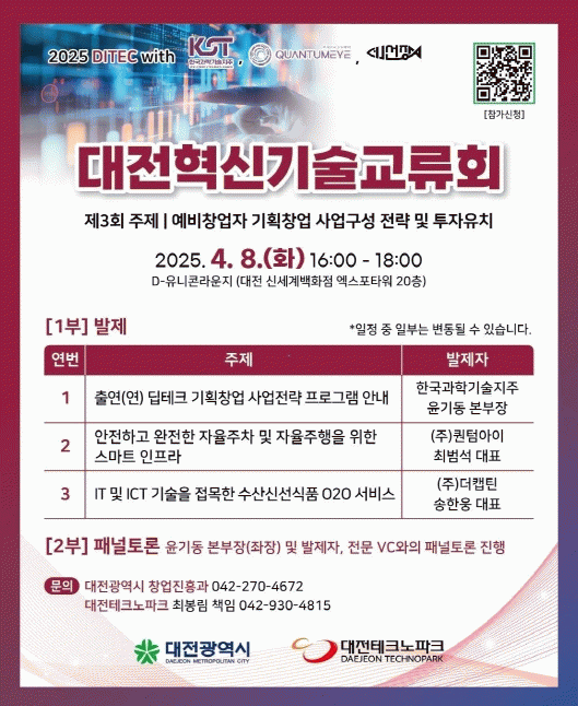 [NWS¹æ¼Û=ÇãÀº¼­ ±âÀÚ]´ëÀü½Ã´Â ¿À´Â 4¿ù 8ÀÏ, ´ëÀü½Å¼¼°è ¿¢½ºÆ÷Ÿ¿ö 20Ãþ D-À¯´ÏÄܶó¿îÁö¿¡¼­ 2025³â Á¦3ȸ¡®´ëÀüÇõ½Å±â¼ú±³·ùȸ(DITEC)¡¯¸¦ °³ÃÖÇÑ´Ù. À̹ø ±³·ùȸ´Â ¡®¿¹ºñâ¾÷ÀÚ ±âȹâ¾÷ »ç¾÷±¸¼º Àü·« ¹× ÅõÀÚÀ¯Ä¡¡¯¸¦ ÁÖÁ¦·Î, ¡¦