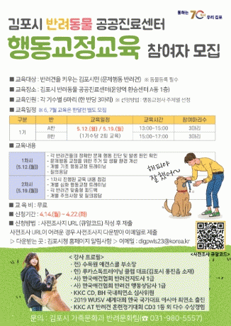 [NWS¹æ¼Û=Çѽ¸ñ ±âÀÚ]±èÆ÷½Ã´Â ¹Ý·Á°ß ¹®Á¦Çൿ ±³Á¤À» À§ÇÑ ±èÆ÷½Ã ¹Ý·Áµ¿¹° °ø°øÁø·á¼¾ÅÍ ¿¬°è ÇÁ·Î±×·¥ÀÎ Çൿ±³Á¤±³À° Âü¿©ÀÚ¸¦ ¸ðÁýÇÑ´Ù. 2025³â ½Å±Ô»ç¾÷À¸·Î ÁøÇàÇÏ´Â ¹Ý·Áµ¿¹° °ø°øÁø·á¼¾ÅÍ Çൿ±³Á¤±³À°Àº Àü¹® ¹Ý·Áµ¿¹° Çൿ¡¦
