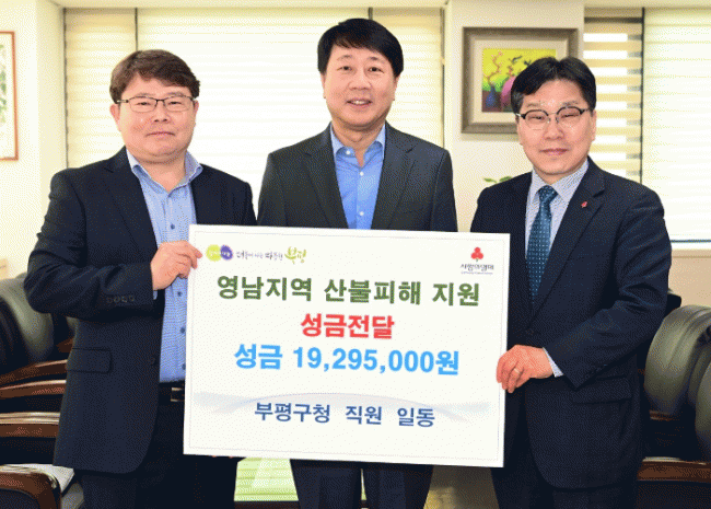 [NWS¹æ¼Û=Çѽ¸ñ ±âÀÚ]ºÎÆò±¸°¡ Áö³­ 28ÀϺÎÅÍ »çÈê°£ ¿µ³²Áö¿ª »êºÒ ÇÇÇØ º¹±¸ ¹× ÀÌÀç¹Î Áö¿øÀ» À§ÇØ ±¸È£¼º±Ý 1õ929¸¸5000¿øÀ» ¸ð±ÝÇß´Ù°í 3ÀÏ ¹àÇû´Ù. ±¸ Á÷¿øµéÀÌ ÀÚ¹ßÀûÀ¸·Î Âü¿©ÇÑ À̹ø ¸ð±ÝÀº °©ÀÛ½º·± »êºÒÇÇÇØ·Î ÅÍÀüÀ» ÀÒ°í¡¦