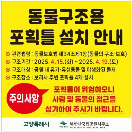 [NWS¹æ¼Û=Çѽ¸ñ ±âÀÚ]°í¾çƯ·Ê½Ã´Â µî»ê°´ ¾ÈÀü ¹× À¯±âµ¿¹° ±¸Á¶¸¦ À§ÇØ 4¿ù 15ÀϺÎÅÍ 19ÀϱîÁö ºÏÇѻ걹¸³°ø¿ø ³» À¯±â°ß¿¡ ´ëÇÑ ÁýÁß±¸Á¶Æ÷ȹÀ» ½Ç½ÃÇÑ´Ù°í ¹àÇû´Ù. ÃÖ±Ù ³¯¾¾°¡ Ç®¸®¸é¼­ ¸¹Àº ½Ã¹ÎµéÀÇ ¾ß¿ÜȰµ¿ÀÌ ¸¹¾ÆÁü¿¡ µû¶ó,¡¦