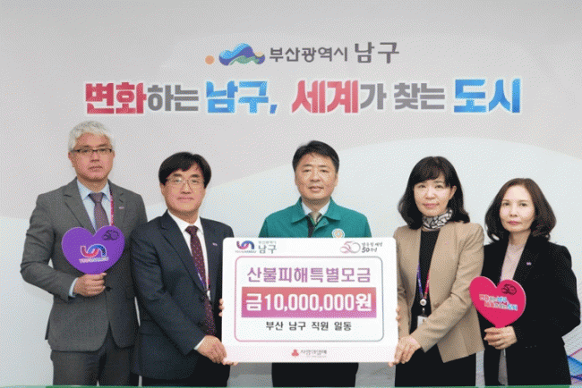 [NWS¹æ¼Û=Çѽ¸ñ ±âÀÚ]ºÎ»ê ³²±¸´Â ÃÖ±Ù ¹ß»ýÇÑ ´ëÇü »êºÒ·Î ÀÎÇØ ÇÇÇØ¸¦ ÀÔÀº ¿µ³² Áö¿ª Áֹε鿡°Ô ÈûÀ» º¸Å±â À§ÇØ º¹±¸ Áö¿ø ¼º±Ý 1,000¸¸¿øÀ» ¸ð±ÝÇß´Ù°í ¹àÇû´Ù. Áö³­ 3¿ù 28ÀϺÎÅÍ 4¿ù 2ÀϱîÁö ±¸Ã» Á÷¿øµéÀ» ´ë»óÀ¸·Î »êºÒ ÇÇ¡¦