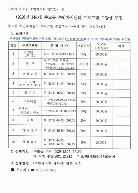 [»çȸ] °í¾ç½Ã ÁÖ±³µ¿, 2026³â 1ºÐ±â ÁÖ¹ÎÀÚÄ¡¼¾ÅÍ ¹®È­°­Á ¼ö°­»ý ¸ðÁý |2025. 12.10