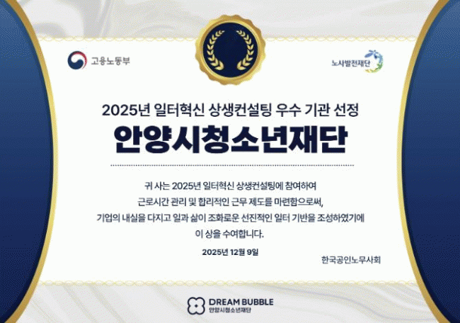 [NWS¹æ¼Û=Çѽ¸ñ ±âÀÚ]¾È¾ç½Ãû¼Ò³âÀç´ÜÀº °í¿ë³ëµ¿ºÎ°¡ ÁÖ°üÇÑ 2025³â ÀÏÅÍÇõ½Å »ó»ýÄÁ¼³ÆÃ¿¡ Âü¿©ÇØ ±Ù·Î½Ã°£ °ü¸® ü°è °³¼±°ú ÇÕ¸®Àû ±Ù¹«Á¦µµ ¸¶·ÃÀ» ÅëÇØ ¿ì¼ö ±â°üÀ¸·Î ¼±Á¤µÆ´Ù. Àç´ÜÀº ÀÏ¡¤»ýȰ ±ÕÇü ±â¹Ý ±¸Ãà°ú Á¶Á÷ ³» Áö¼Ó¡¦