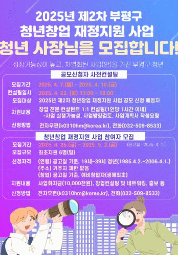 [»çȸ] ¡®Ã»³â! ºÎÆò¿¡¼­ â¾÷Ç϶ó!!¡¯ ºÎÆò±¸, 2025³â Á¦2Â÷ û³ââ¾÷ ÀçÁ¤Áö¿ø »ç¾÷ Âü¿©ÀÚ ¸ðÁý |2025. 04.03