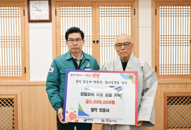 [NWS¹æ¼Û=Çѽ¸ñ ±âÀÚ]¿µ´ö±º ¿µ´öÀ¾¿¡ ÀÖ´Â ´ëÇѺұ³Á¶°èÁ¾ ¹ý·û»çÀÇ ÁÖÁö ¹ý¼º ½º´ÔÀÌ Áö³­ 2ÀÏ ±è±¤¿­ ¿µ´ö±º¼ö¸¦ ¸¸³ª »êºÒ ÇÇÇØ·Î ¾î·Á¿òÀ» °Þ°í ÀÖ´Â ÀÌ¿ôµéÀ» À§ÇØ ½á´Þ¶ó¸ç ¼º±Ý 500¸¸ ¿øÀ» Àü´ÞÇß´Ù. ¹ý¼º ½º´ÔÀº ¡°»êºÒ ÇÇÇØ°¡¡¦