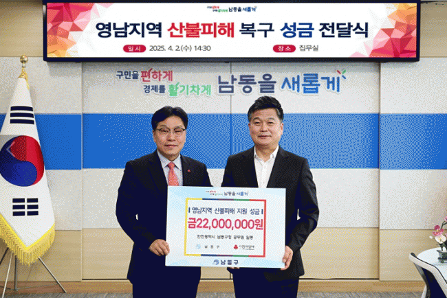 [NWS¹æ¼Û=Çѽ¸ñ ±âÀÚ]ÀÎõ½Ã ³²µ¿±¸´Â ¼Ò¼Ó Á÷¿øµéÀÇ ±âºÎ·Î ¿µ³²Áö¿ª »êºÒÇÇÇØ º¹±¸¸¦ À§ÇÑ ¼º±Ý 2,200¸¸ ¿øÀ» ¸¶·ÃÇØ ±âºÎÇÑ´Ù°í 3ÀÏ ¹àÇû´Ù. ¸ð±ÝµÈ ¼º±ÝÀº »çȸº¹Áö°øµ¿¸ð±Ýȸ »ç¶ûÀÇ ¿­¸Å¸¦ ÅëÇØ »êºÒÇÇÇØ ÀÌÀç¹Îµé¿¡°Ô Àü´ÞµÉ¡¦
