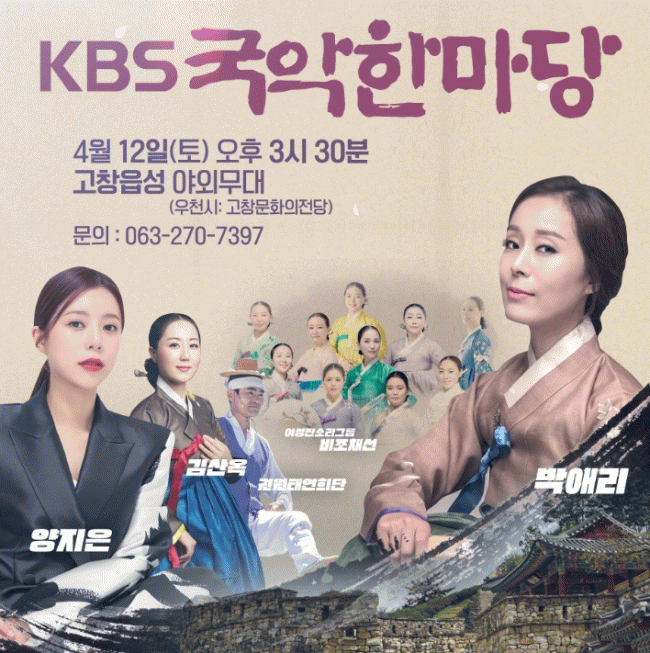 [NWS¹æ¼Û=Çѽ¸ñ ±âÀÚ]¡®´ëÇѹα¹ ÆÇ¼Ò¸®ÀÇ º»Ç⡯ °íⱺÀÌ KBSÇѱ¹¹æ¼Û°ú ÇÔ²² ±¹¾ÇÇѸ¶´ç °ø¿¬À» ¿À´Â 12ÀÏ ¿ÀÈÄ 3½Ã 30ºÐ¿¡ °íâÀ¾¼º Ư¼³¹«´ë¿¡¼­ ÁøÇàÇÑ´Ù. (¿ìõ½Ã °í⹮ȭÀÇÀü´ç, ¹«·á°ü¶÷) ±¹¾ÇÇѸ¶´çÀº ±¹³» ÃÖÁ¤»ó ±¹¾ÇÀε顦