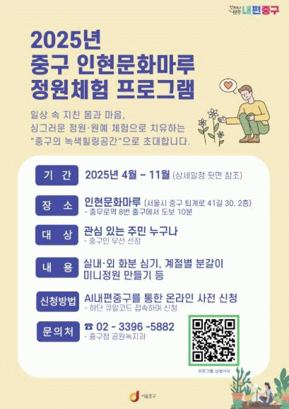 [NWS¹æ¼Û=Çѽ¸ñ ±âÀÚ]¼­¿ï Áß±¸°¡ ²É»ùÃßÀ§°¡ ´©±×·¯Áø 4¿ù ÃʺÎÅÍ ¸¶À»¸¶´ç°ú °ñ¸ñÁ¤¿ø¿¡ È­Ãʸ¦ ½É°í ¸¶À»Á¤¿ø»ç ¾ç¼º ¹× Ȱµ¿, Á¤¿øÃ¼Çè ÇÁ·Î±×·¥À» ¿î¿µÇÑ´Ù. ÁֹεéÀÌ ÀÏ»ó ¼Ó ¾îµð¼­³ª °¡±îÀÌ¿¡¼­ »õº½À» Áñ±æ ¼ö ÀÖµµ·Ï ¸¶À»¸¶´ç¡¦