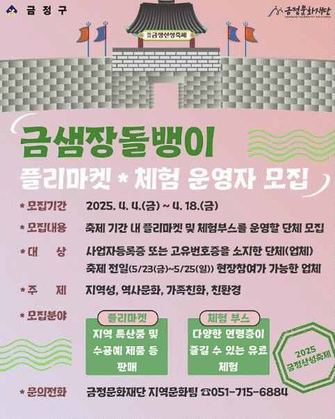 [NWS¹æ¼Û=Çѽ¸ñ ±âÀÚ]ºÎ»ê½Ã ±ÝÁ¤±¸ ±ÝÁ¤¹®È­Àç´ÜÀº ¿À´Â 5¿ù 23ÀϺÎÅÍ 5¿ù 25ÀϱîÁö 3Àϰ£ ¿­¸®´Â 2025 ±ÝÁ¤»ê¼º ÃàÁ¦ÀÇ ¡®±Ý»ù Àåµ¹¹ðÀÌ¡¯ÇÁ·Î±×·¥¿¡ Âü¿©ÇÒ Çø®¸¶ÄÏ ¹× üÇè ºÎ½º ¿î¿µÀÚ¸¦ 4¿ù 4ÀϺÎÅÍ 4¿ù 18ÀϱîÁö ¸ðÁýÇÑ´Ù°í ¹àÇû¡¦