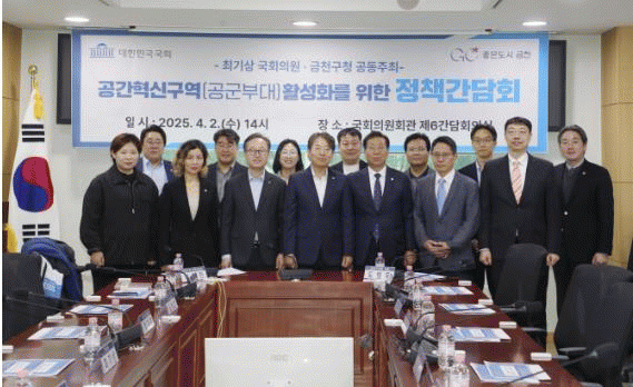 [NWS¹æ¼Û=Çѽ¸ñ ±âÀÚ]±Ýõ±¸´Â 4¿ù 2ÀÏ(¼ö) ±¹È¸ÀÇ¿øÈ¸°ü Á¦6°£´ãȸÀǽǿ¡¼­ ¡®°ø°£Çõ½Å±¸¿ª(±Ýõ±¸ °ø±ººÎ´ë ºÎÁö) Ȱ¼ºÈ­¸¦ À§ÇÑ Á¤Ã¥°£´ãȸ¡¯¸¦ °³ÃÖÇß´Ù°í ¹àÇû´Ù. °£´ãȸ´Â ±¹Åä±³ÅëºÎÀÇ °ø°£Çõ½Å±¸¿ª ¼±µµ»ç¾÷ ´ë»óÁö·Î ¼±Á¤µÈ µ¶¡¦