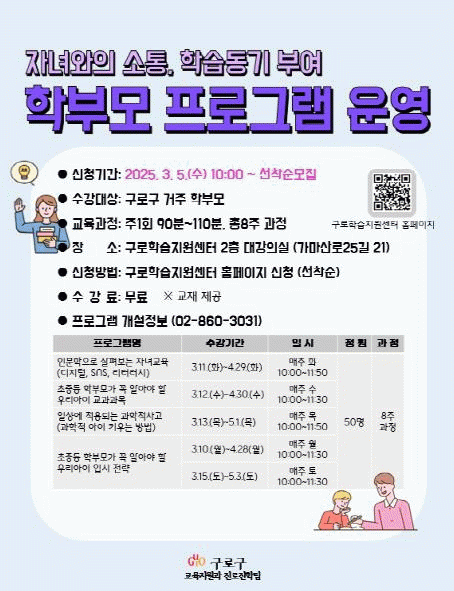[NWS¹æ¼Û=Çѽ¸ñ ±âÀÚ]±¸·Î±¸°¡ 12¿ù±îÁö ±¸·ÎÇнÀÁö¿ø¼¾ÅÍ¿¡¼­ ¡®2025³â Çкθð ÇÁ·Î±×·¥¡¯À» ¿î¿µÇÑ´Ù. Çкθð ÇÁ·Î±×·¥Àº °ü³» Çкθ𸦠´ë»óÀ¸·Î ºÎ¸ð±³À° °­Á¸¦ »ó¼³ ¿î¿µÇÏ¿© ºÎ¸ð¿Í ÀÚ³àÀÇ °ü°è °³¼±°ú ÀÚ³à Áöµµ¿¡ À¯¿ëÇÑ ÇнÀ¡¦