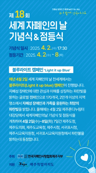 [NWS¹æ¼Û=Çѽ¸ñ ±âÀÚ]Á¦ÁÖÆ¯º°ÀÚÄ¡µµ´Â 2ÀÏ ¡®Á¦18ȸ ¼¼°è ÀÚÆóÀÎÀÇ ³¯(World Autism Awareness Day)¡¯À» ¸Â¾Æ µµ³» °ü°ø¼­¿Í Áö¿ª ¸í¼Ò µîÀÇ °Ç¹° º®¸éÀ» ÆÄ¶õºûÀ¸·Î ¹àÈ÷´Â ¡®ºí·ç¶óÀÌÆ®(Light it up Blue) Ä·ÆäÀΡ¯À» ÆîÄ£´Ù. ¼¼°è ¡¦