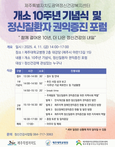 [NWS¹æ¼Û=Çѽ¸ñ ±âÀÚ]Á¦ÁÖÆ¯º°ÀÚÄ¡µµ¿Í Á¦ÁÖ±¤¿ªÁ¤½Å°Ç°­º¹Áö¼¾ÅÍ´Â ¼¾ÅÍ °³¼Ò 10ÁÖ³âÀ» ¸Â¾Æ ¿À´Â 11ÀÏ ¿ÀÈÄ 2½Ã Á¦ÁÖ´ëÇб³º´¿ø ´ë°­´ç¿¡¼­ ¡®Á¦ÁÖ±¤¿ªÁ¤½Å¼¾ÅÍ °³¼Ò 10Áֳ⠱â³ä½Ä ¹× Á¤½ÅÁúȯÀÚ ±ÇÀÍÁõÁø Æ÷·³¡¯À» °³ÃÖÇÑ´Ù. ¡®ÇÔ²²¡¦