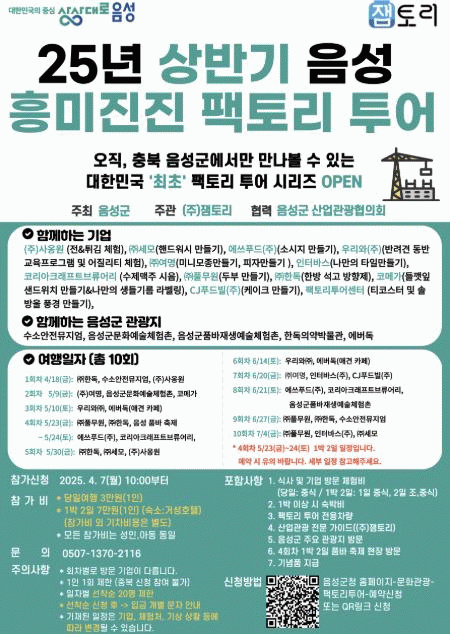 [NWS¹æ¼Û=Çѽ¸ñ ±âÀÚ]À½¼º±ºÀº ¿ÃÇØµµ Èï¹Ì·Î¿î °øÀå üÇèÀ» ÁÖÁ¦·Î »ó¹Ý±â ÆÑÅ丮 Åõ¾î¸¦ ¿î¿µÇÑ´Ù°í 3ÀÏ ¹àÇû´Ù. À½¼º±ºÀÇ ¡®Èï¹ÌÁøÁø ÆÑÅ丮 Åõ¾î¡¯´Â 2900¿© °³ÀÇ ±â¾÷ü°¡ ¸ð¿© ÀÖ´Â »ê¾÷µµ½Ã À½¼º±º¿¡¼­¸¸ °æÇèÇÒ ¼ö ÀÖ´Â °øÀå ü¡¦