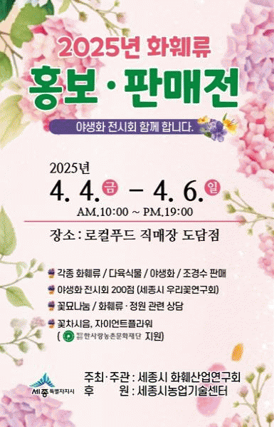 [NWS¹æ¼Û=Çѽ¸ñ ±âÀÚ]¼¼Á¾Æ¯º°ÀÚÄ¡½Ã È­ÈÑ»ê¾÷¿¬±¸È¸°¡ ¿À´Â 4¡­6ÀÏ 3Àϰ£ ·ÎÄÃǪµå Á÷¸ÅÀå µµ´ãÁ¡¿¡¼­ Áö¿ª È­ÈÑ»ê¾÷ Ȱ¼ºÈ­¿Í ²É ¼Òºñ ÃËÁøÀ» À§ÇÑ ¡®2025³â ¼¼Á¾ È­ÈÑ·ù È«º¸ÆÇ¸ÅÀü¡¯À» °³ÃÖÇÑ´Ù. ¼¼Á¾½Ã ³ó¾÷±â¼ú¼¾ÅÍ ÈÄ¿øÀ¸·Î ¿­¸°¡¦