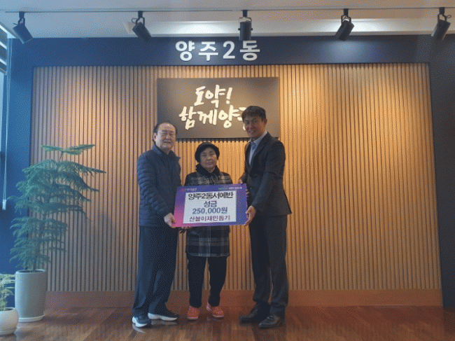 [NWS¹æ¼Û=Çѽ¸ñ ±âÀÚ]¾çÁֽà ¾çÁÖ2µ¿Àº Áö³­ 1ÀÏ ¾çÁÖ2µ¿ ¼­¿¹¹Ý(°­»ç À̼ö¿¬)¿¡¼­ ´ëÇü »êºÒ ÇÇÇØ¸¦ ÀÔÀº ÀÌÀç¹ÎÀ» µ½±â À§ÇØ ¼º±Ý 25¸¸¿øÀ» ±âŹÇß´Ù°í 2ÀÏ ¹àÇû´Ù. À̹ø ¼º±ÝÀº ¼­¿¹¹Ý °­»ç¿Í 17¸íÀÇ ¼ö°­»ýµéÀÌ ÀÚ¹ßÀûÀ¸·Î ¶æÀ» ¸ð¡¦