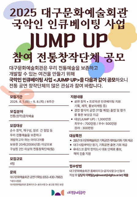 [NWS¹æ¼Û=Çѽ¸ñ ±âÀÚ] ´ë±¸¹®È­¿¹¼úȸ°üÀº ÀüÅë À½¾Ç ¿¹¼úÀεéÀ» ¹ß±¼ÇÏ°í ¿¹¼ú Ȱµ¿¿¡ ±â¹ÝÀÌ µÉ ¼ö ÀÖ´Â ±âȸ¸¦ Á¦°øÇÏ´Â ±¹¾Ç ÀÎÅ¥º£ÀÌÆÃ »ç¾÷ ¡®JUMP UP¡¯ Âü¿©´Üü¸¦ ¸ðÁýÇÑ´Ù. ±¹¾Ç ÀÎÅ¥º£ÀÌÆÃ »ç¾÷ ¡®JUMP UP¡¯Àº ¿ì¸® ÀüÅ뿹¼ú¡¦
